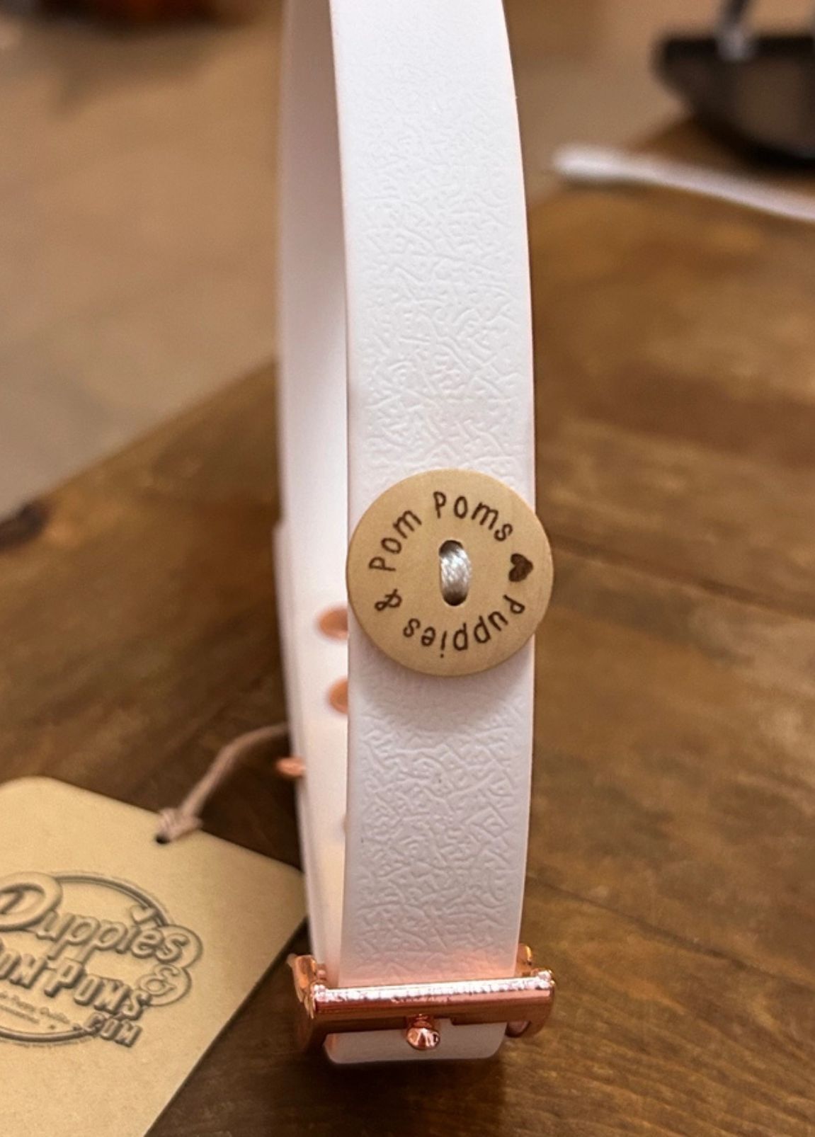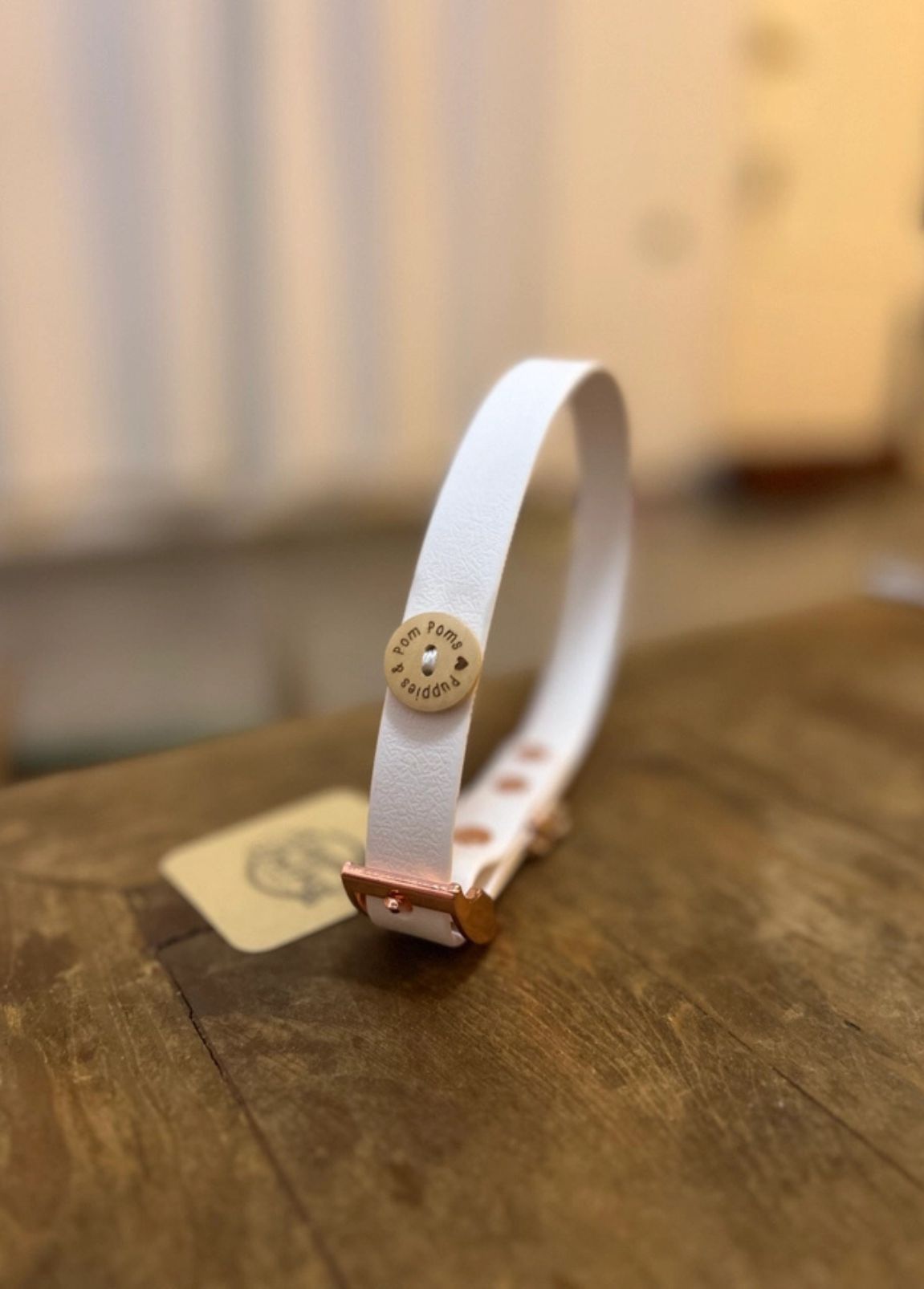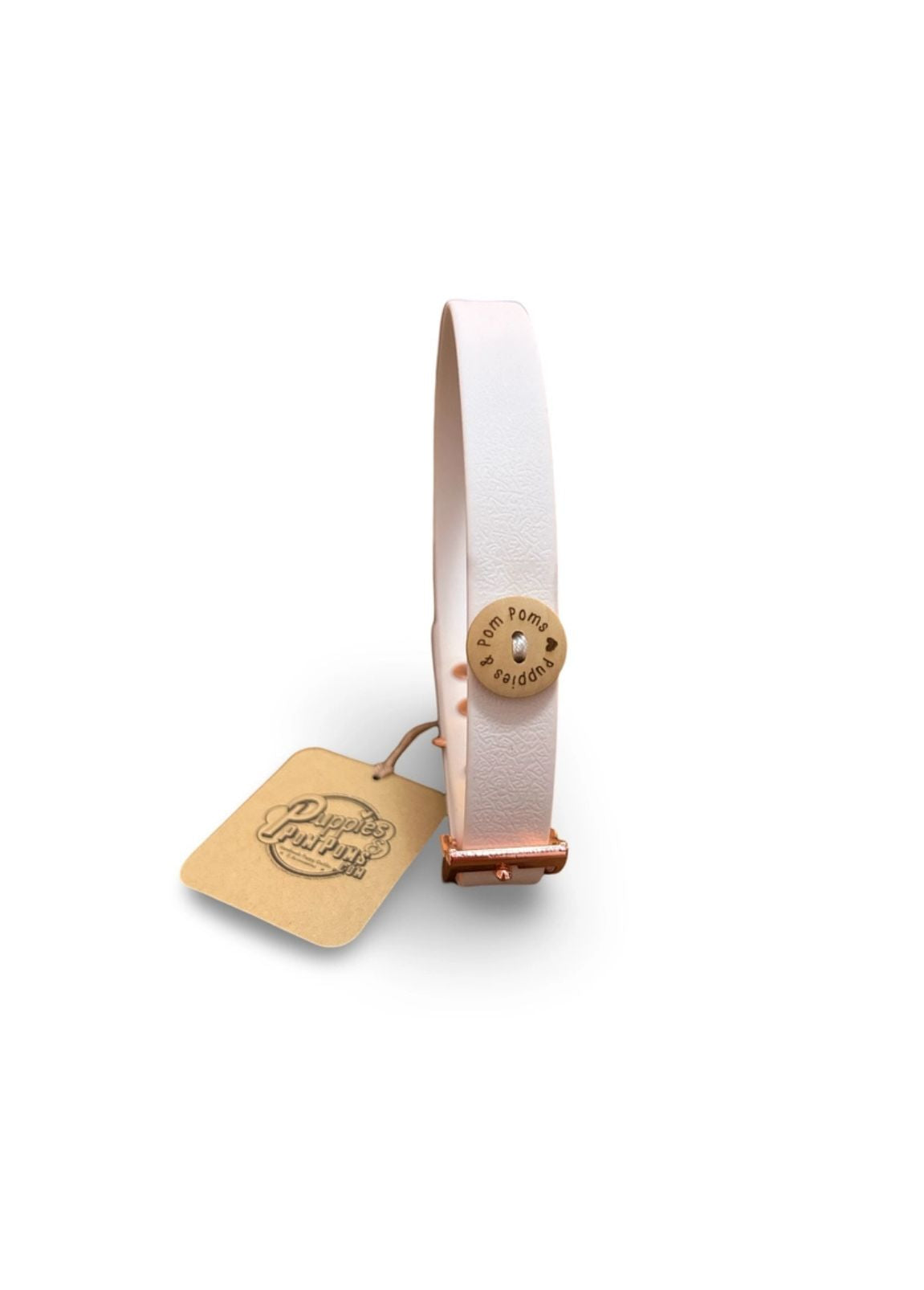 Se procura uma coleira resistente, elegante e feita à mão com dedicação, esta coleira da Puppies & Pom Poms é a escolha perfeita! Criada com couro vegan e uma combinação exclusiva de biothane e fita impermeável, esta coleira proporciona um ajuste confortável e máxima durabilidade para acompanhar o seu cão em todas as aventuras.