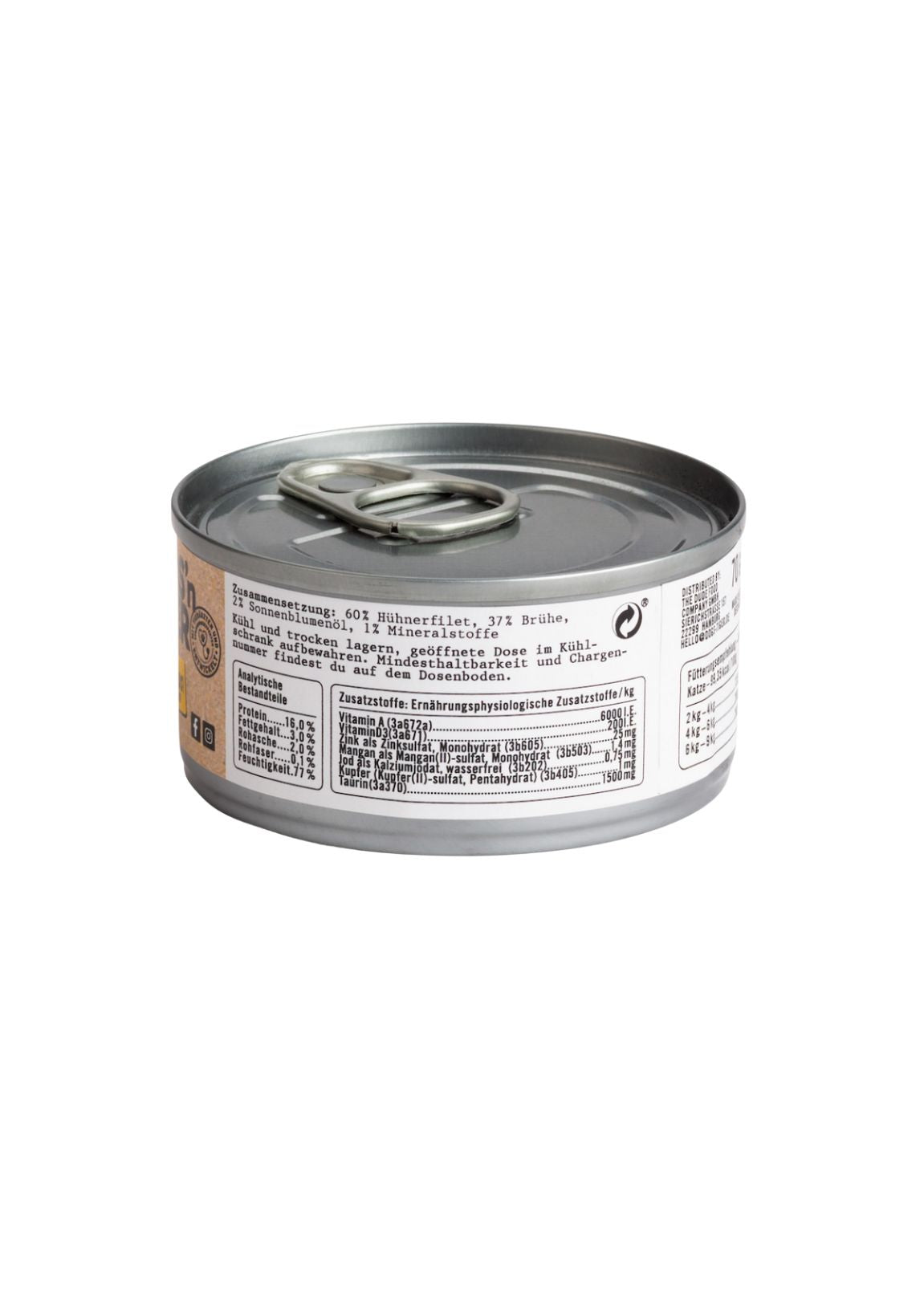 Esta comida húmida de frango é um verdadeiro mimo gourmet para o teu gato. Feita com 60% de filé de frango fresco e cozinhado delicadamente em caldo saboroso, é uma refeição completa, rica em proteínas de alta qualidade, vitaminas A e B e taurina, essencial para a saúde felina.
